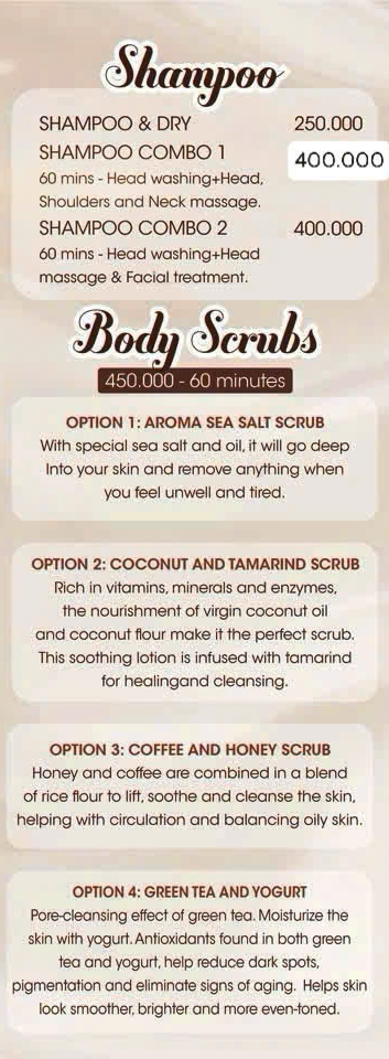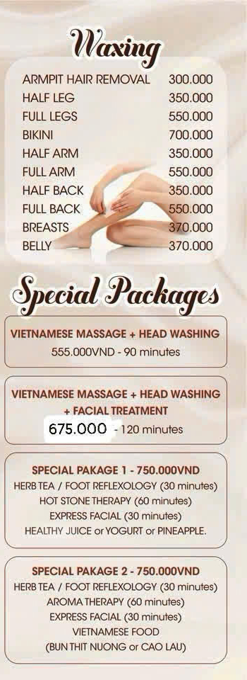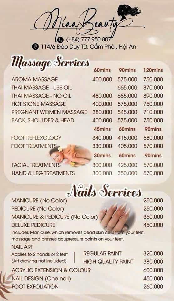 - Free pick up or drop off in Da Nang (For 2 or more guests and using the service for 90 minutes or more).